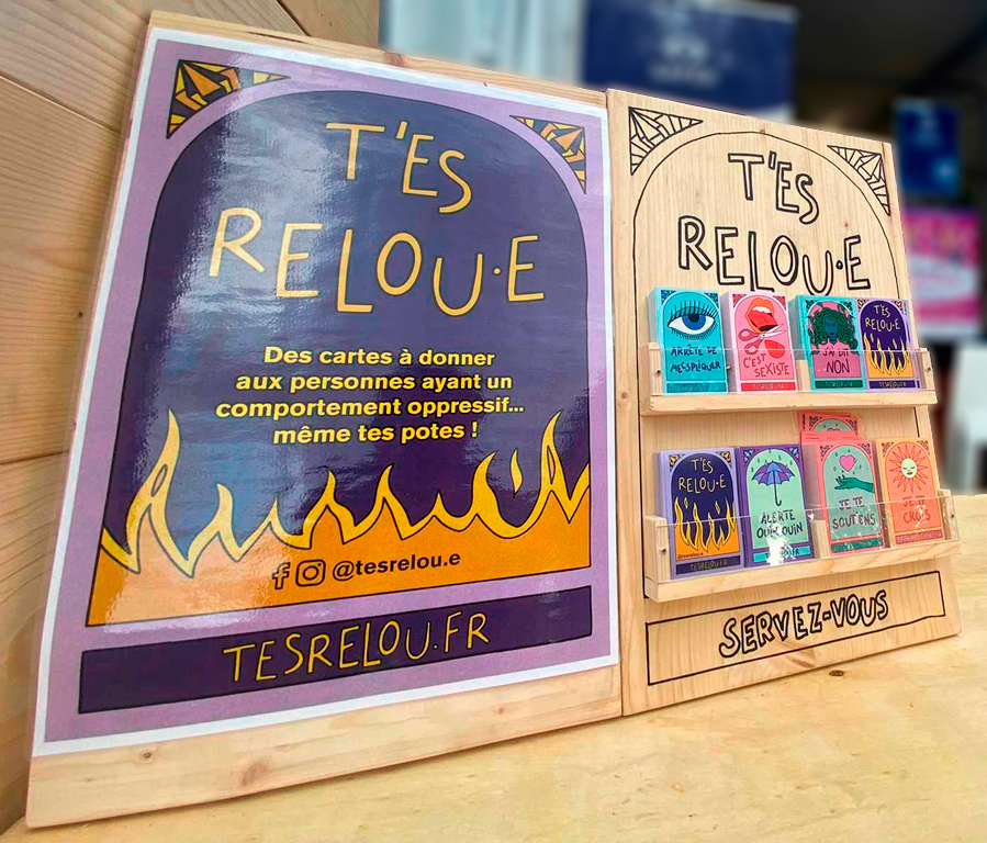 Nous proposons cinq modèles de cartes anti-relou·e – “T’es relou·e“, “J’ai dit non“, “C’est sexiste”, “Arrête de mecspliquer” et “Alerte ouin-ouin” et deux modèles de cartes de soutien : “Je te soutiens” et “Je te crois“. Tous sont au format d’une carte de visite (85x54mm) et sont aussi disponible en stickers (85x55mm).