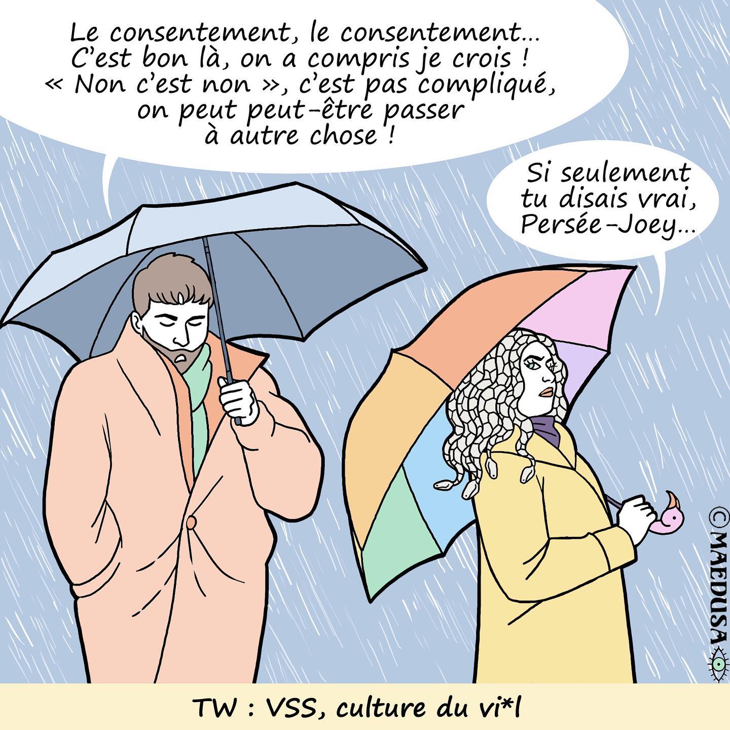 On entend souvent l’argument que s’assurer sans cesse du consentement de l’autre rend les interactions fastidieuses et leur fait perdre leur naturel. Mais, cela n’est vrai que parce que nous avons toustes – sans exception – été mal éduqué‧es au consentement, et avons intégré comme normal des comportements et des réflexes qui ne devraient pas l’être. Comme tout apprentissage et déconstruction, cela demande du temps et de la pratique pour l’intégrer de manière fluide. De plus, il vaut mieux prendre des précautions, quitte à ce que cela prenne du temps, que risquer de se passer involontairement du consentement de l’autre. Il n’y a jamais “trop” de consentement !